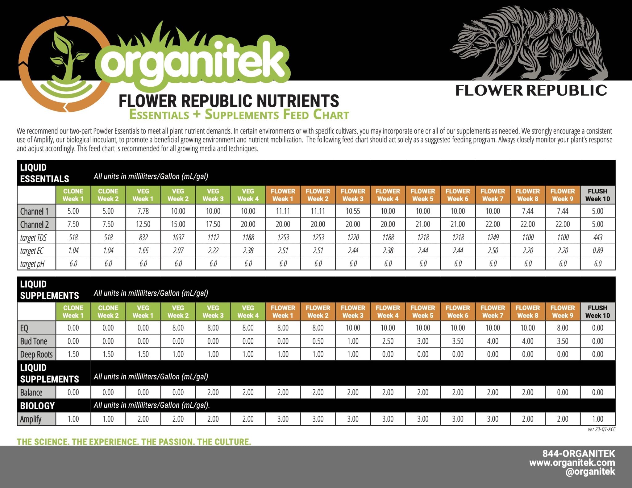 We recommend our two-part Powder Essentials to meet all plant nutrient demands. You may incorporate one or all of our supplements in certain environments or with specific cultivars as needed. We strongly encourage the consistent use of Amplify, our biological inoculant, to promote a beneficial growing environment and nutrient mobilization. The following feed charts should act solely as a suggestion. Continuously monitor your plant’s response and adjust accordingly. This feed chart is recommended for all growing media and techniques.